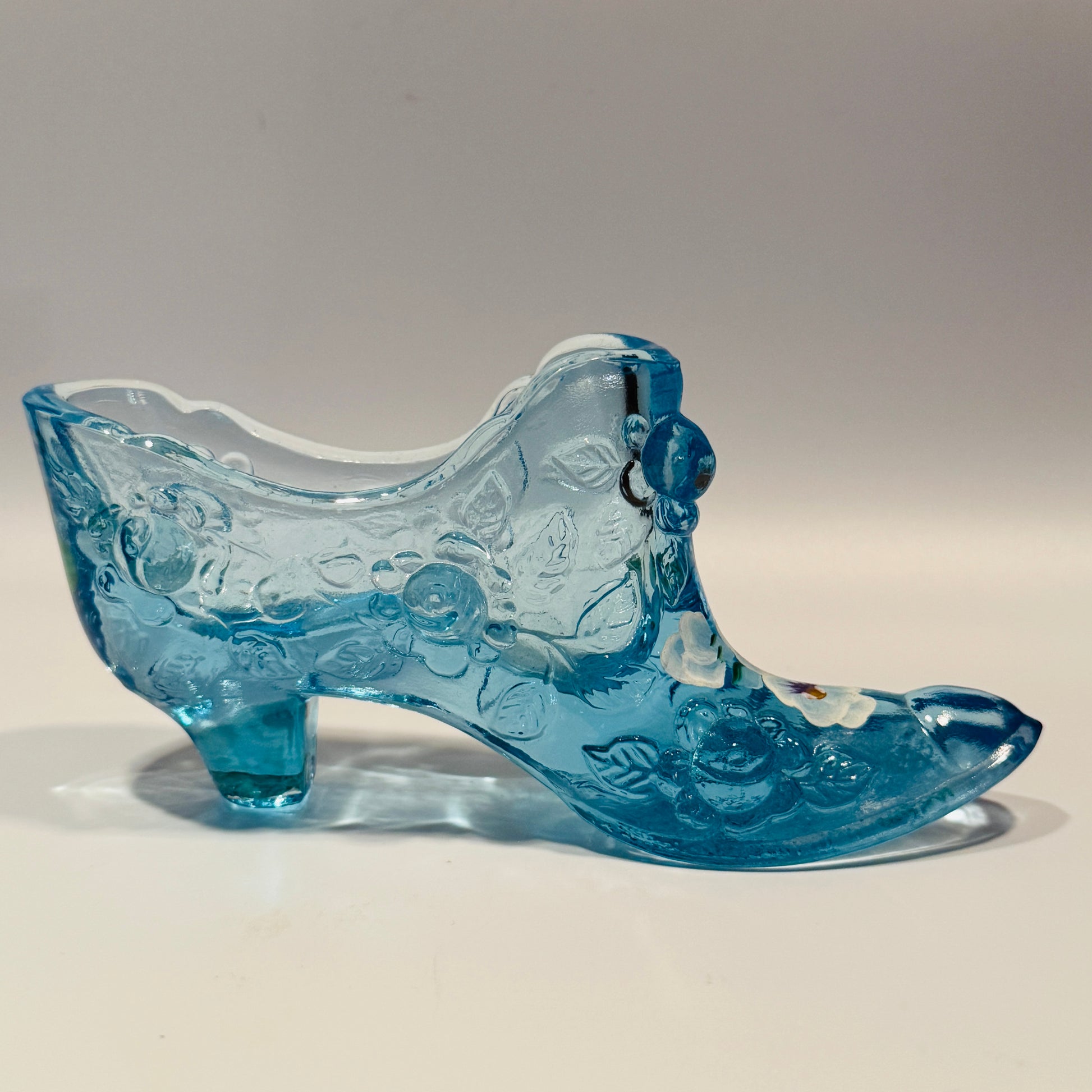 Fenton Handpainted Daisy Button Blue Floral Glass Shoe