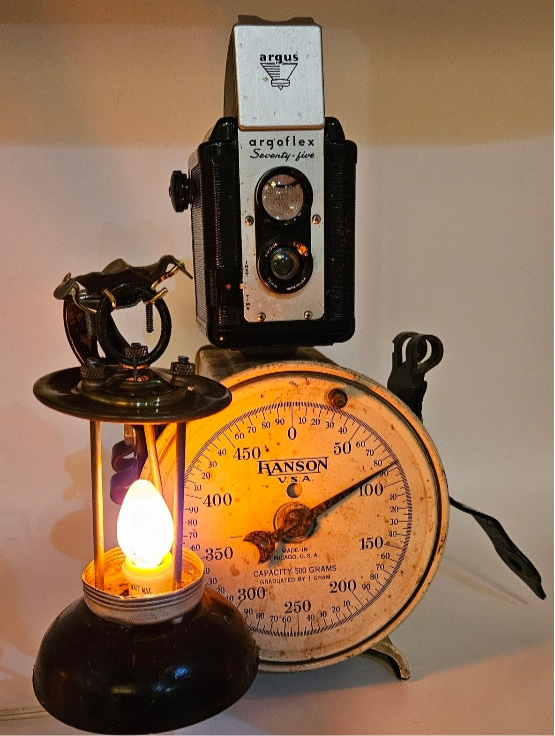 Made by local Norfolk artist using vintage scale, camera, gate hardware, and other bits and bobs from the workbench.