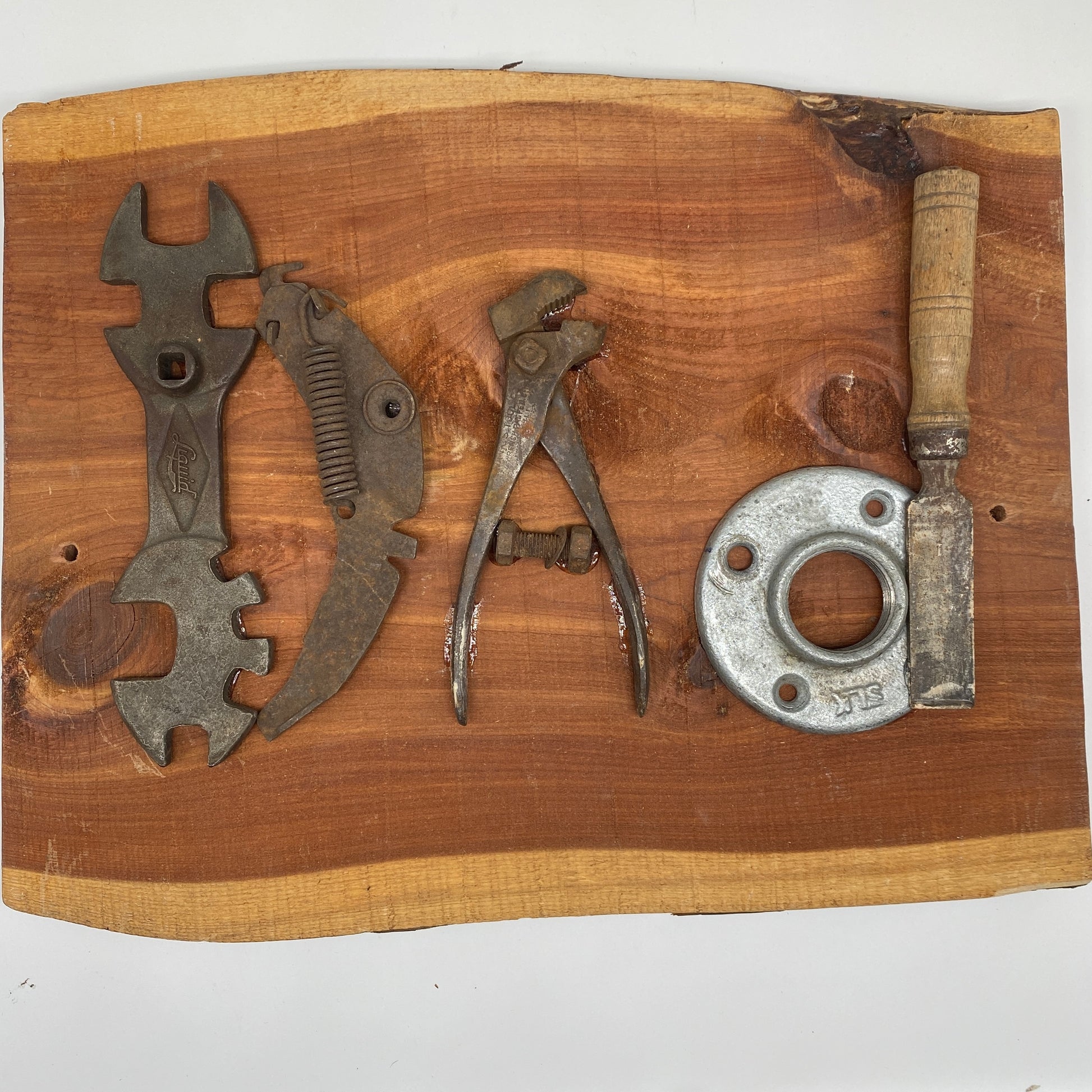 Live edge wood sign with the word "Dad" made out of random workbench bits and bobs.