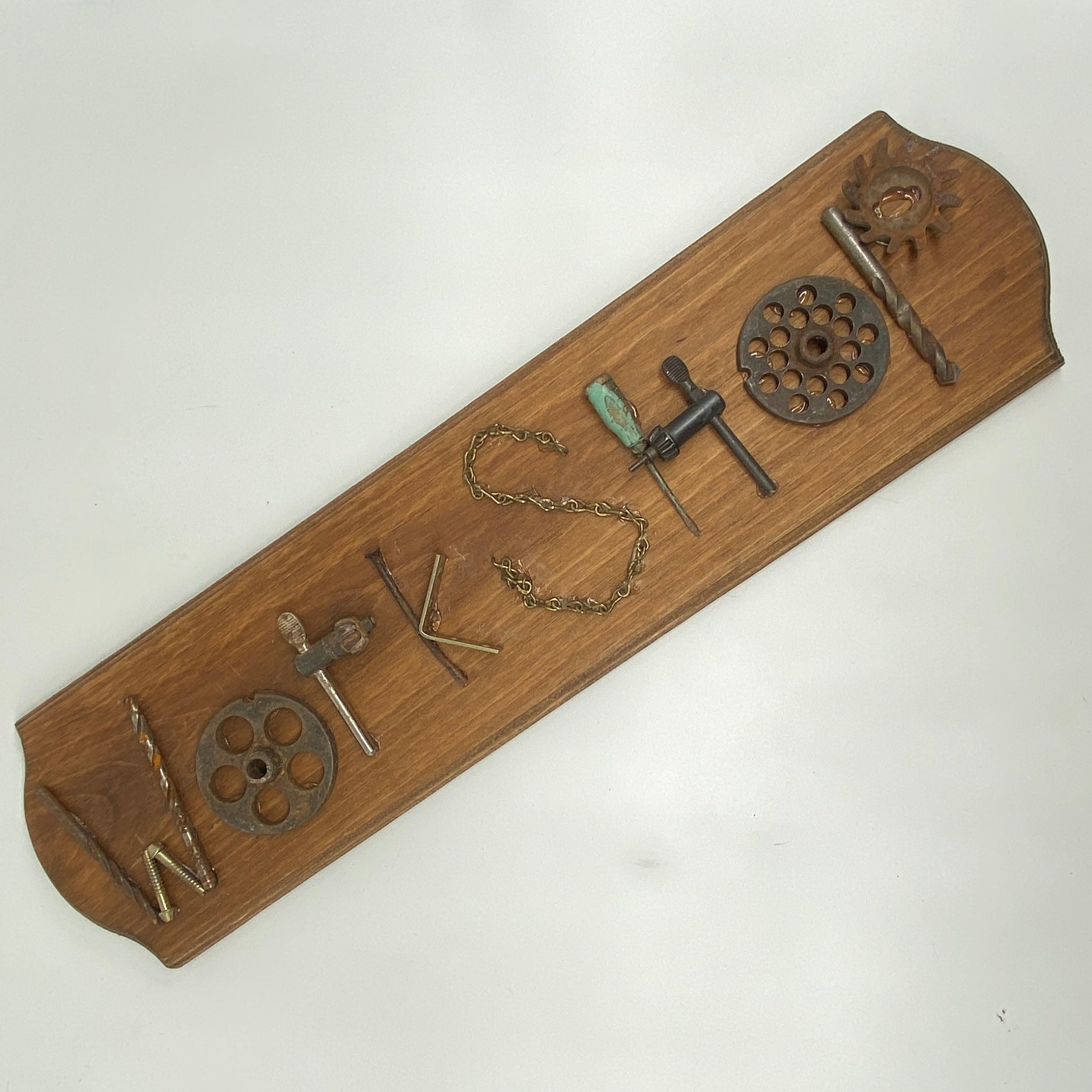 Routed wood plaque with the word "Workshop" made out of random workbench bits and bobs.